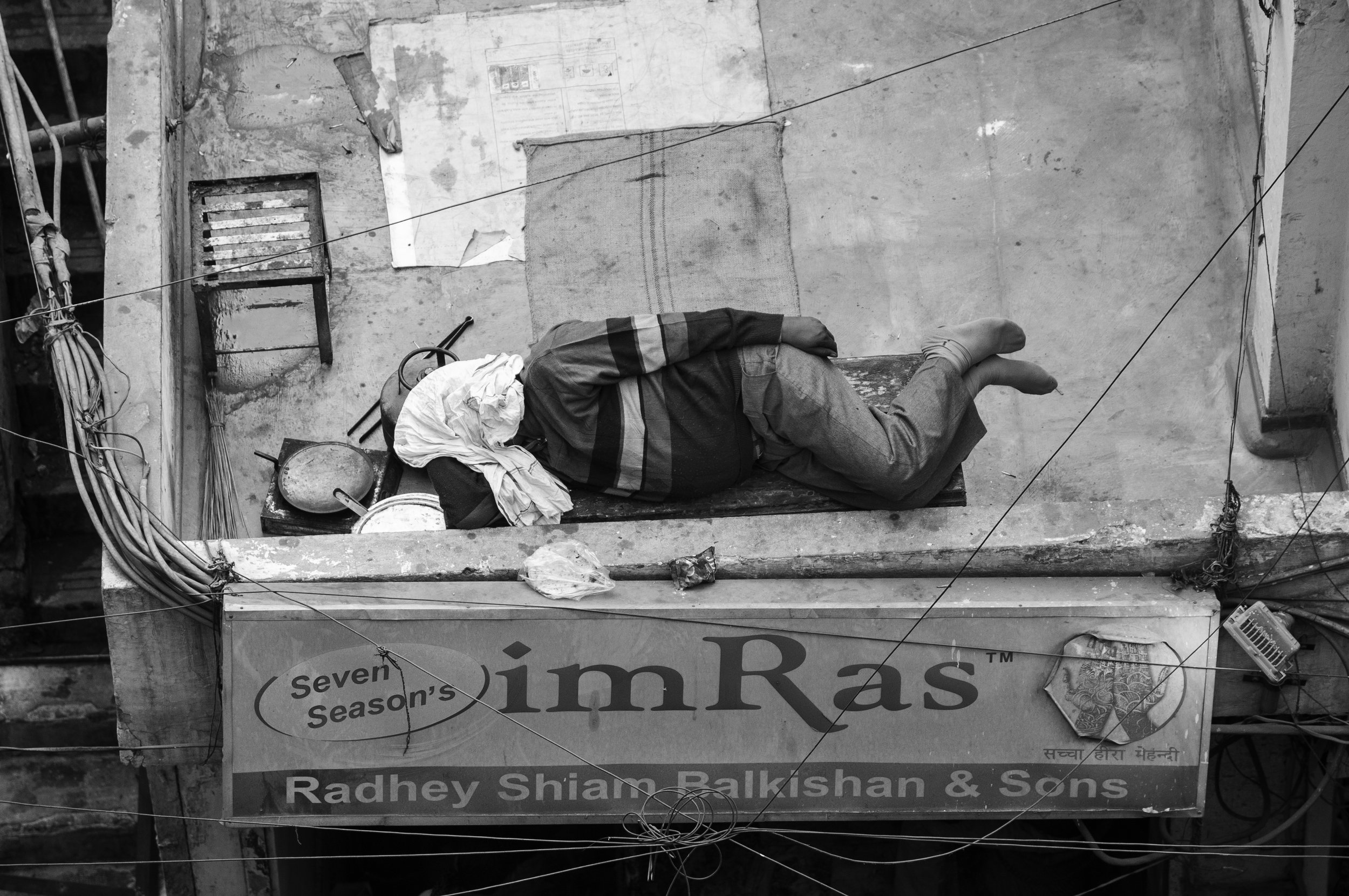 En mand sovende på et tag, hævet op over byens underliggende støj og aktivitet.