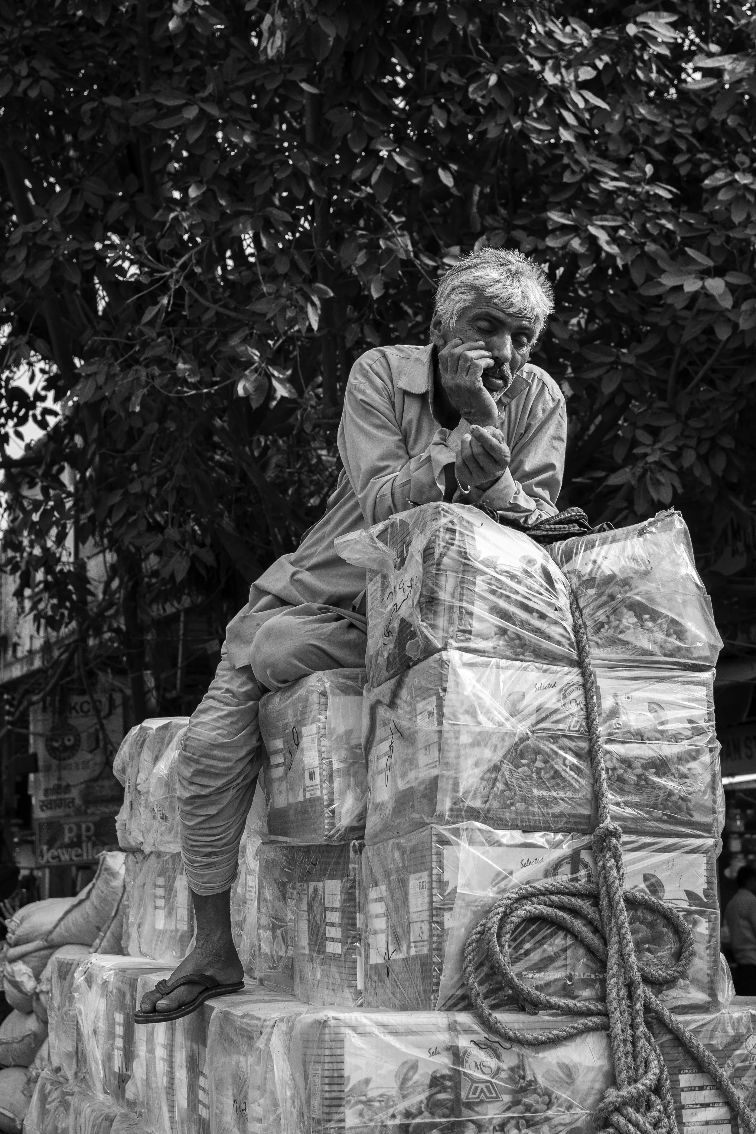 Manden i billedet her, har ikke blot fundet et sted at sidde; han har transformeret sit hårde arbejdsmiljø - de skarpe kanter af pakkede kasser og den stramme snøring af det kraftige reb - til et midlertidigt fristed.